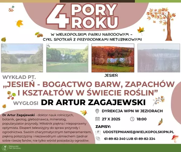 Wykład pt. "Jesień - bogactwo barw, zapachów i kształtów w świecie roślin" - 4 pory roku w Wielkopolskim Parku Narodowym, cykl spotkań z przyrodnikami nietuzinkowymi. Prelegent dr Artur Zagajewski - doktor nauk rolniczych, botanik, geolog, gleboznawca, mineralog, popularyzator przyrody. Miłośnik piękna i niepoprawny optymista. Ekspert telewizyjny do spraw przyrody