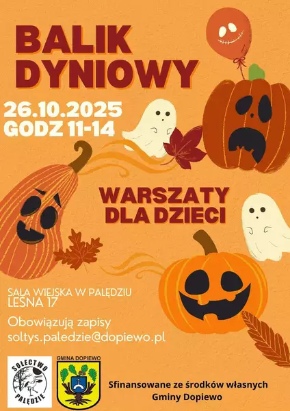 Data wydarzenianiedziela, 2025-10-26, 11:00OrganizatorSołectwo PalędzieUrząd Gminy Dopiewo26 października 2025 roku, w godzinach 11:00 - 14:00, w sali wiejskiej w Palędziu przy ulicy Leśnej 17, odbędzie się balik dyniowy i warsztaty dla dzieci. Obowiązują zapisy: @email