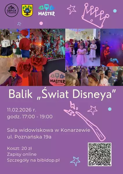 Tego popołudnia sala widowiskowa w Konarzewie zamieni się w prawdziwy bajkowy świat, w którym spotkają się rycerze, zwierzątka, piraci i bohaterowie znani z animacji. Dzieci czeka wspólna taneczna przygoda przy najpiękniejszej muzyce, animacje ruchowe inspirowane światem Disneya oraz pokaz bajkowych kostiumów.