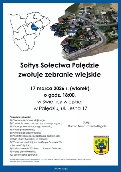 Data wydarzeniawtorek, 2026-03-17, 18:00OrganizatorUrząd Gminy DopiewoZapraszamy na zebranie wiejskie, które odbędzie się 17 marca o godz. 18:00 w Świetlicy wiejskiej w Palędziu przy ul. Leśnej 17.